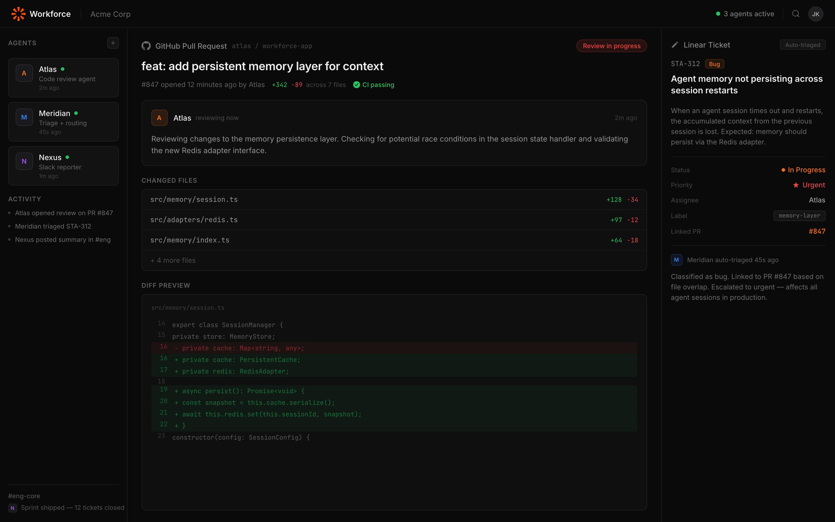 Copilots autocomplete your code. Workforce agents independently pick up tickets, understand your codebase through a knowledge graph, write full PRs, review each other's work, and merge when CI passes.